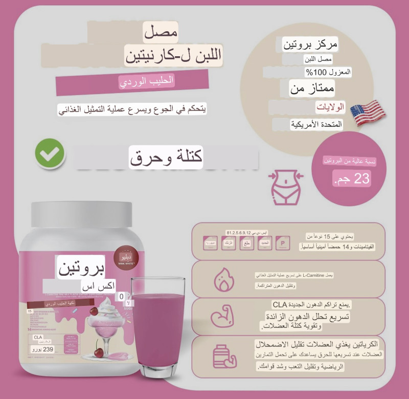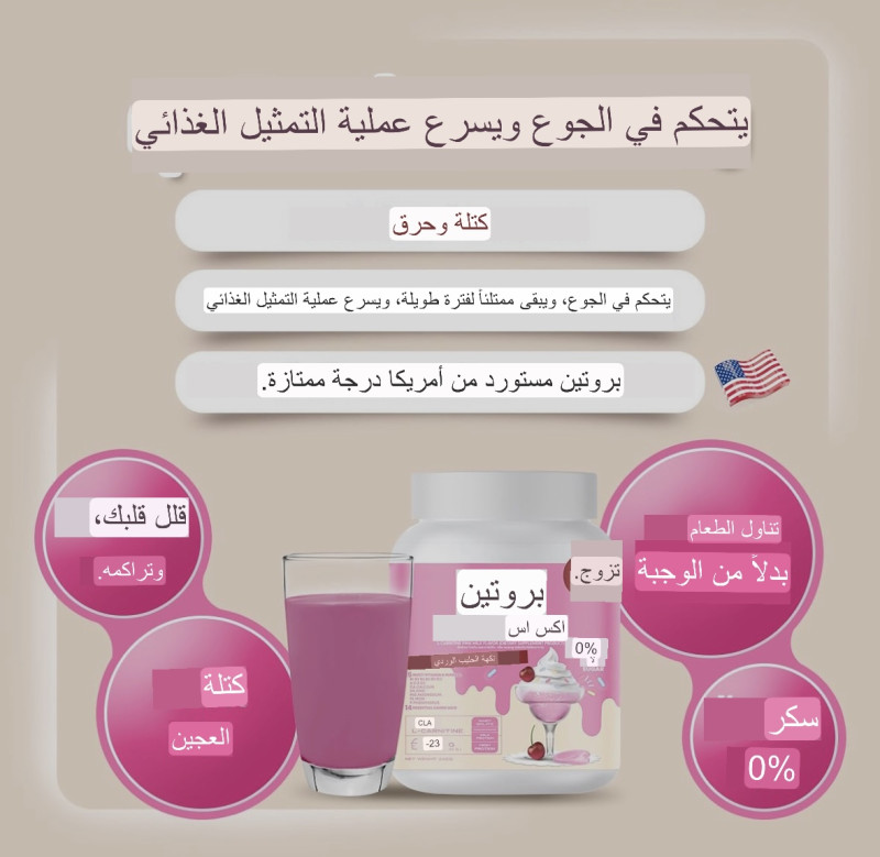 بروتين نكهة الحليب الوردي هذه النكهة لذيذة جدا. الحليب الوردي عطرة جدا. أريدك أن تحاول ذلك. صيغة للسيطرة على الجوع وتسريع عملية التمثيل الغذائي [2] يساعد على تكملة البروتين. [٢] تسريع تفتيت الدهون الزائدة. [؟] تسريع عملية التمثيل الغذائي [٧] السيطرة على الجوع والشبع لفترة طويلة. [2] تقوية العضلات [2] نسبة عالية من البروتين 23 جم. القليل من السعرات الحرارية، لا الدهون، لا السكر